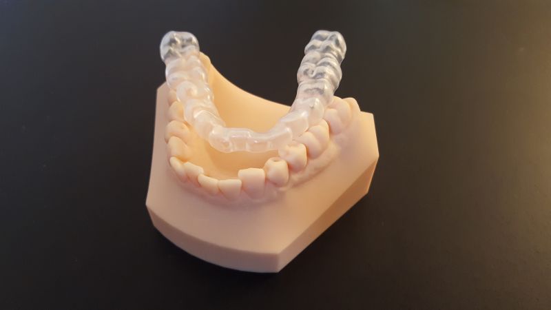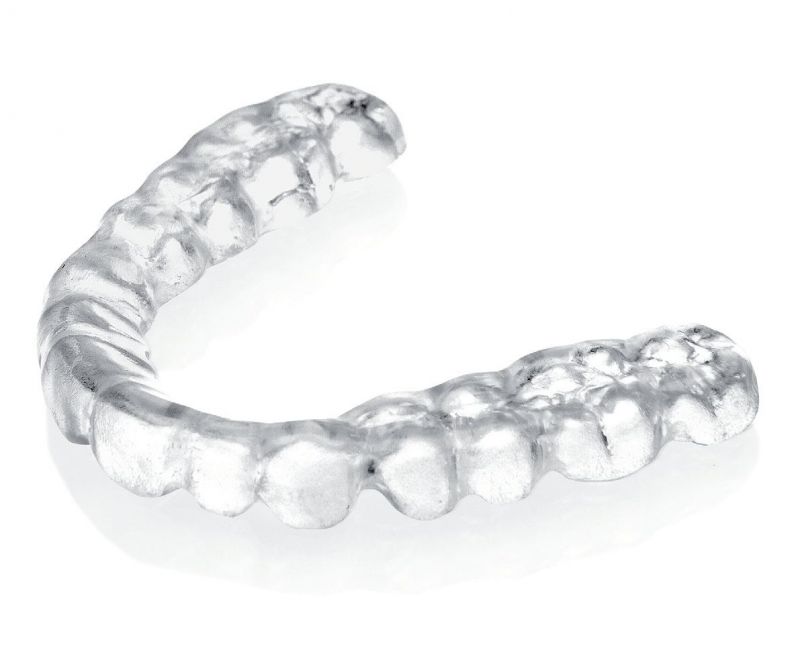 Besonders angenehm für den Patienten ist darüber hinaus die hohe Transparenz des Materials, die dazu führt, dass die Schiene im Mund nahezu unsichtbar wird.