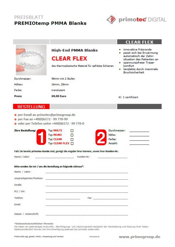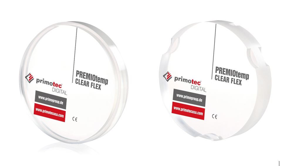 PREMIOtemp CLEAR FLEX ist die neue, thermoplastische und damit besonders innovative Fräsronde für CAD/CAM gefertigte Aufbissschienen im primotec DIGITAL Produktprogramm.