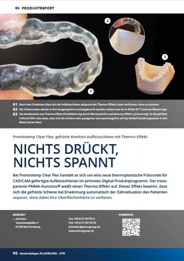 - PREMIOtemp CLEAR FLEX ist die neue, thermoplastische und damit besonders innovative Fräsronde für CAD/CAM gefertigte Aufbissschienen.